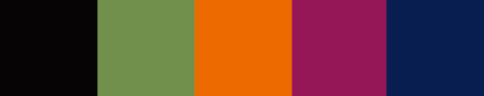 This still makes for a rich, deep palette of olive and ochre. Swatch Hexes: #070405; #70904c; #ec6a00; #961758; #081e51