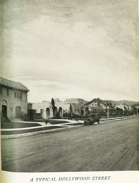 Miles and miles of quiet residential streets, busy shopping ceters, well populated grammar and high schools, thriving banks, wealthy churches, neautiful hshops ranging in size from tiny band-boxes to Robertson’s Department Store, two newspaper plants, theaters, real estate offices, hotels, and gardens, make Hollywood distinctly a city of homes.