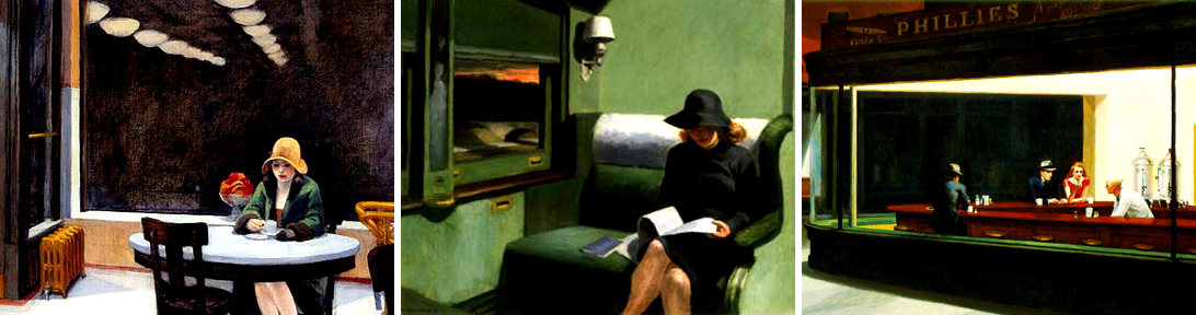 Edward Hopper’s realistic visualizations of early/mid 20th century America– from “Automat” to “Compartment C” to his seminal “Nighthawks”– are candid, rarely pretty, always pensive and often melancholy. The ominous, dark reality of the brightly lit American Dream, Hopper’s paintings (for me, anyway) are to American art what Charles Bukowski was to American literature and David Lynch is to American film.