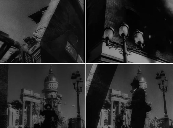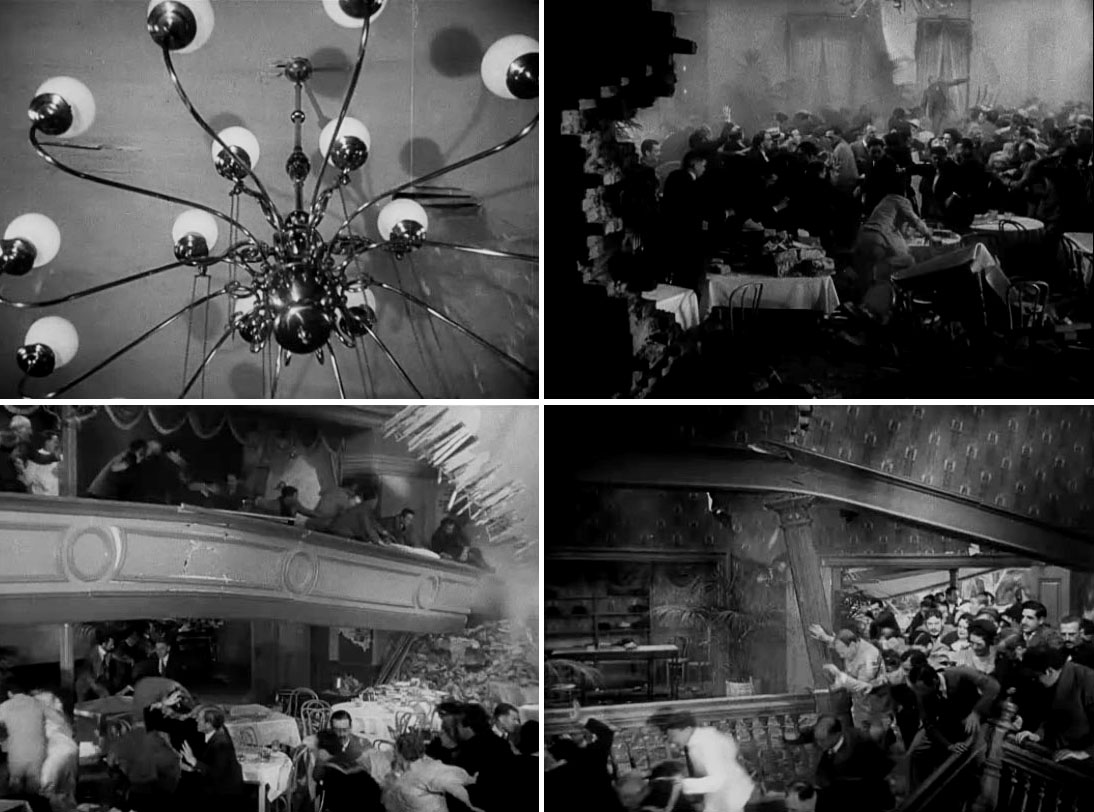 The second reason Basevi and Vorkapich hit a home run here, is their shared vision: Basevi’s technical wizardy and vision, and Vorkapich’s keen talent of threading together images into powerful collage movement, sound, and light. Vorkapich makes full use of Basevi’s monumental effects: the city hall collapsing; the dance hall splitting in two; the streets of San Francisco buying itself in brick and mortar. But he balances it with startling, unexpected close-ups and the human figure. A little girl’s crying face fills the frame, and is cut quickly with the side of a brick building toppling down onto her. Human movement blurs these frames, and behind them we see debris, mayhem, and dying bodies. It’s a mixed media canvas, and the composting of film trickery and photo-journalistic sensibilities results in something that is disturbing and uncommonly affecting.